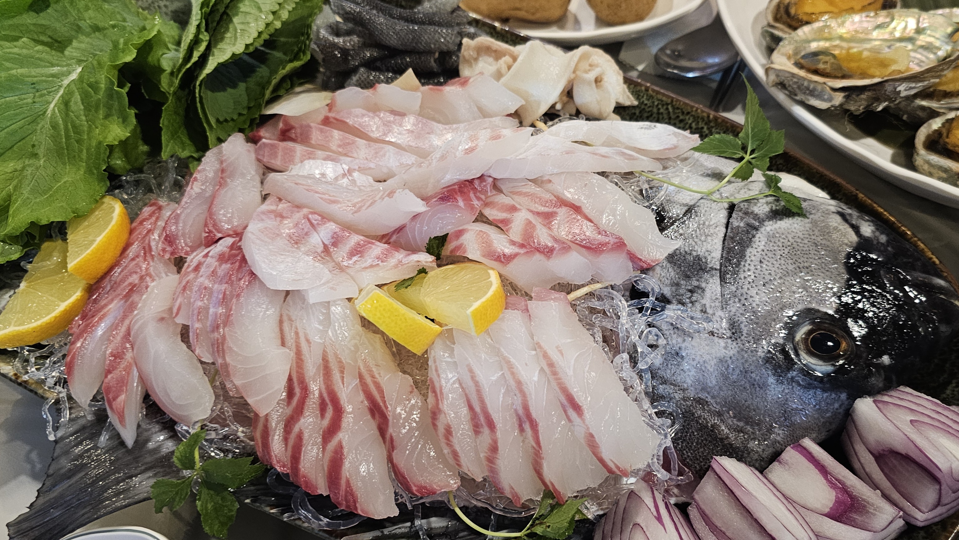자연산 돌돔이다. 5짜가 넘어보였다. 주인이 낚시로 낚았다는데 좋은 사람들과 함께한 자리, 때와 시가 떨어졌다. 명불허전이다. 회 맛 말이다. 입 안에 착 달라붙는 식감과 풍미는 엄지척이다.